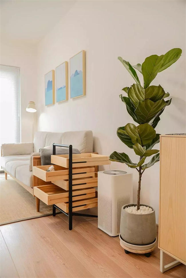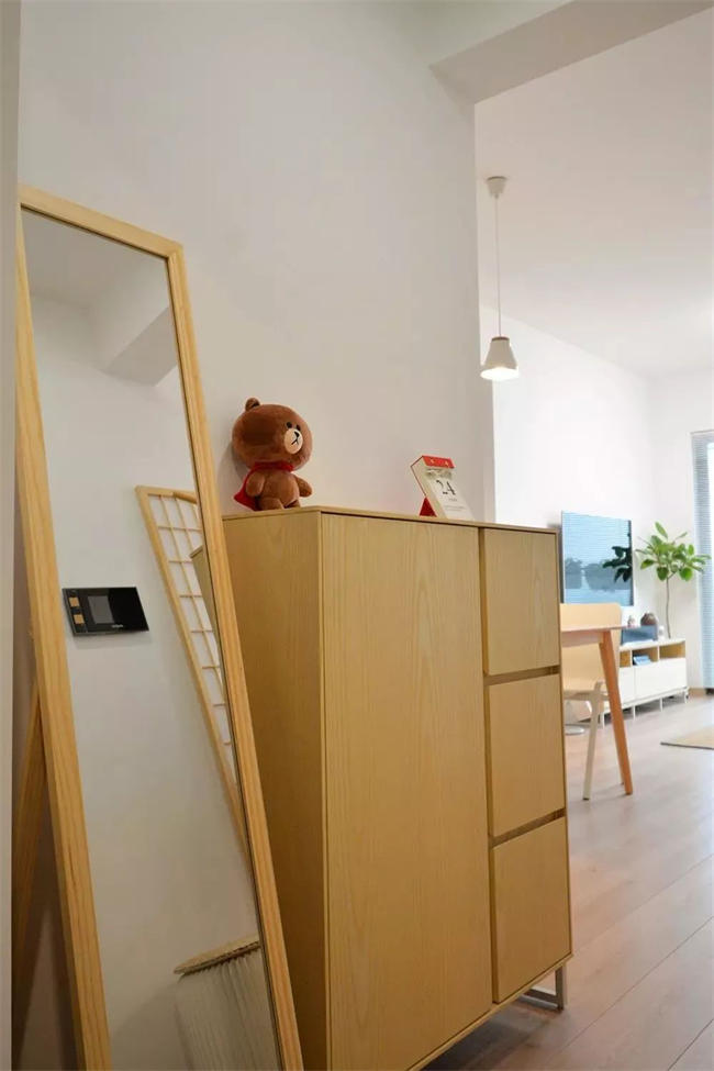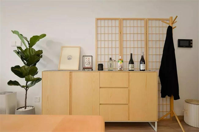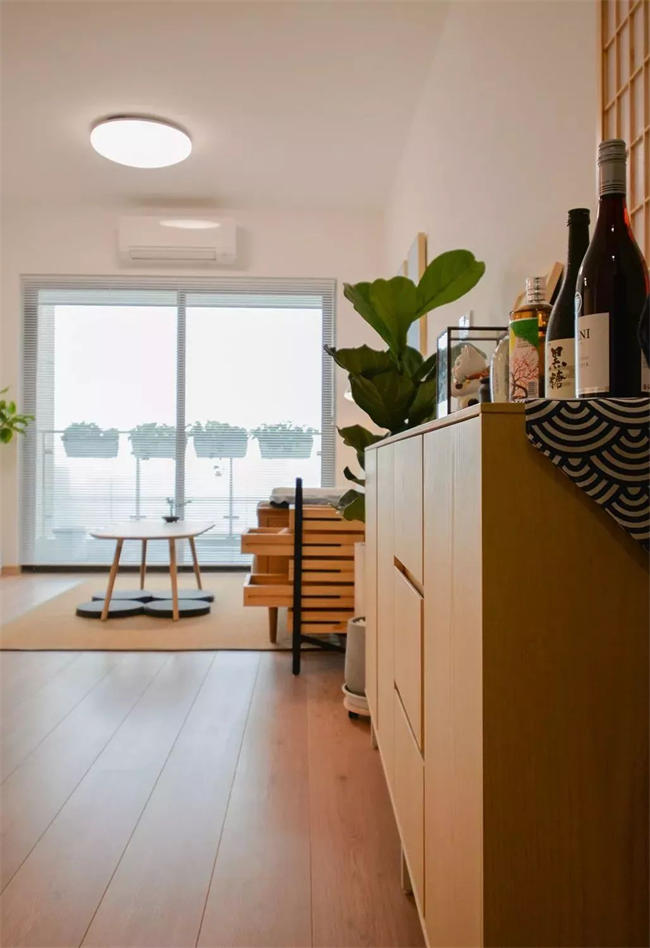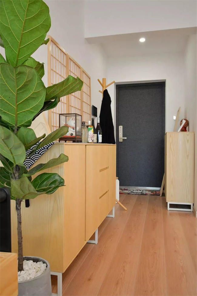 ▲ 玄關用原木收納柜+原木地板,整個空間充滿原木的氣息,搭配大株綠植裝飾,入戶就給人清新的感覺。