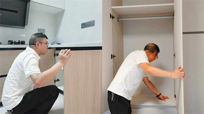 △我們的監(jiān)理正在對(duì)屋內(nèi)的定制櫥柜、衣柜進(jìn)行檢查,確認(rèn)柜體是否水平垂直,