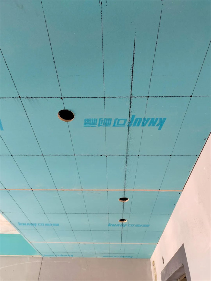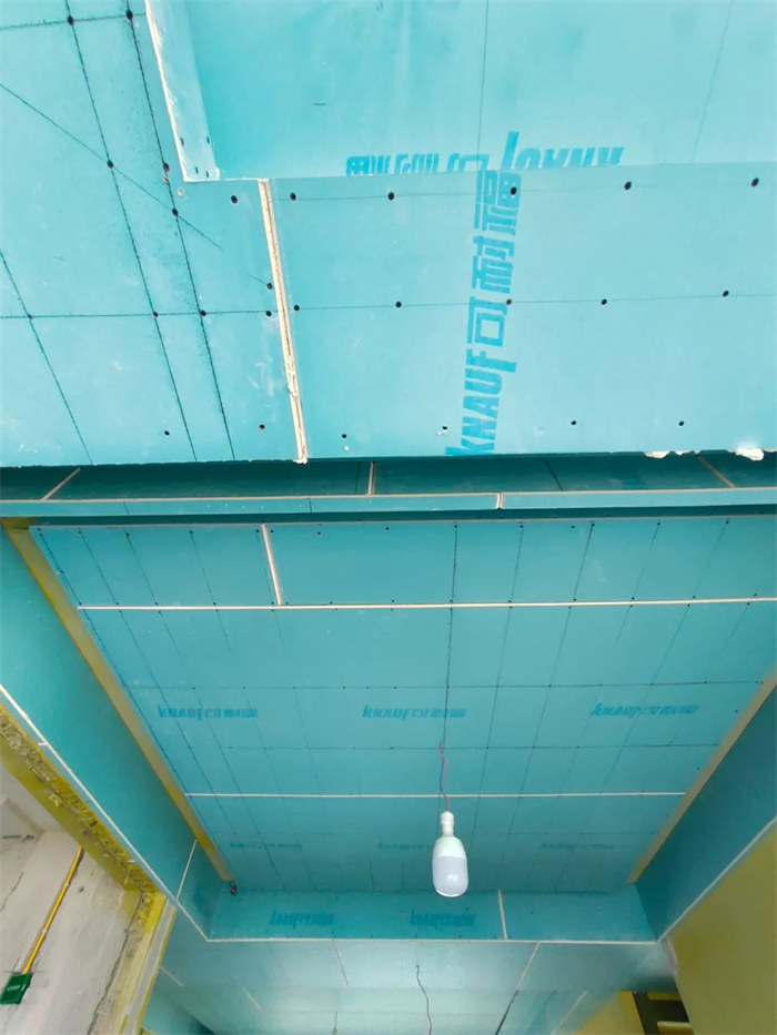 主龍骨的間距為800mm,墻邊距離200-300mm,吊棚外延口邊龍骨橫豎交叉時(shí)必須采用搭接及三角斜拉鉚固,吊筋與主龍骨銜接穩(wěn)固無松動(dòng);吊頂平梁,梁下過一層石膏板,厚度10mm,縫隙用發(fā)泡膠軟連接,所有石膏均要求切割平直,陽角不允許用石膏板原邊,合格。