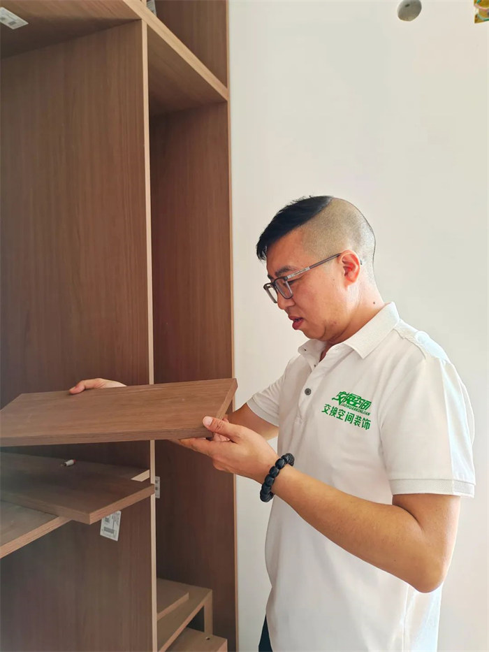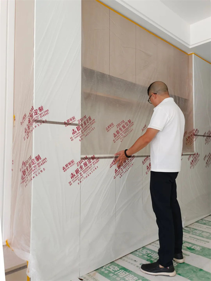 這是我們的監(jiān)理正在對(duì)屋內(nèi)定制柜進(jìn)行檢查,確認(rèn)柜體是否水平垂直,五金配件安裝牢固。檢查內(nèi)部隔板平整,無松動(dòng)。確保柜體表面無劃傷、瑕疵,安裝穩(wěn)固。