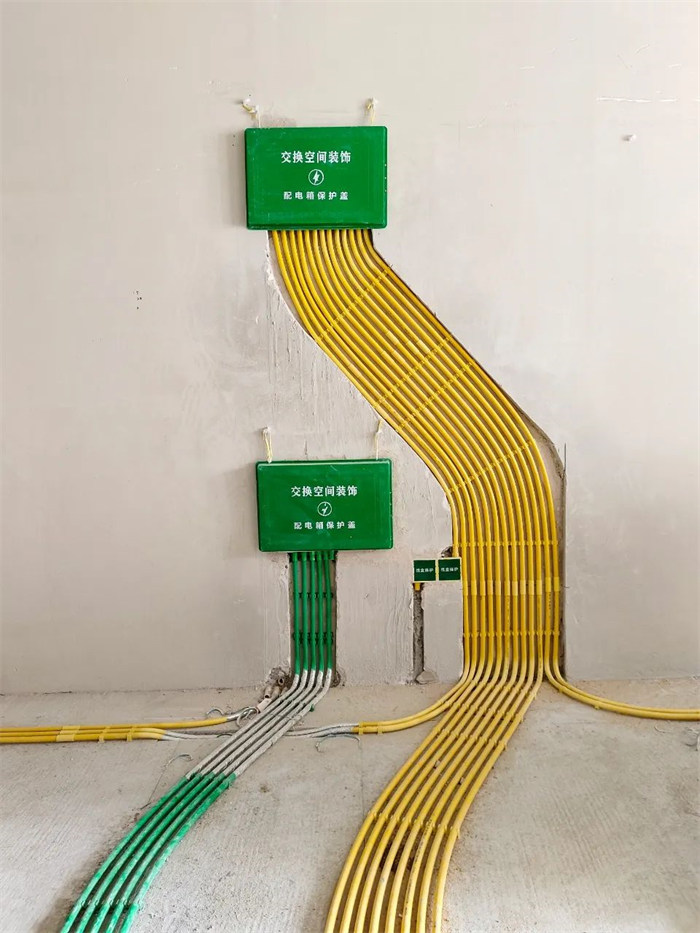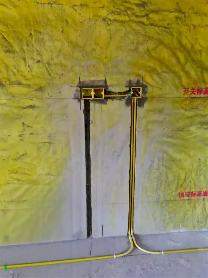 △強(qiáng)弱電線管交叉,強(qiáng)電黃色、弱電綠色不允許混用,弱電線管整齊纏繞錫箔紙,兩頭平直,兩邊各超出強(qiáng)電線管150mm,合格。