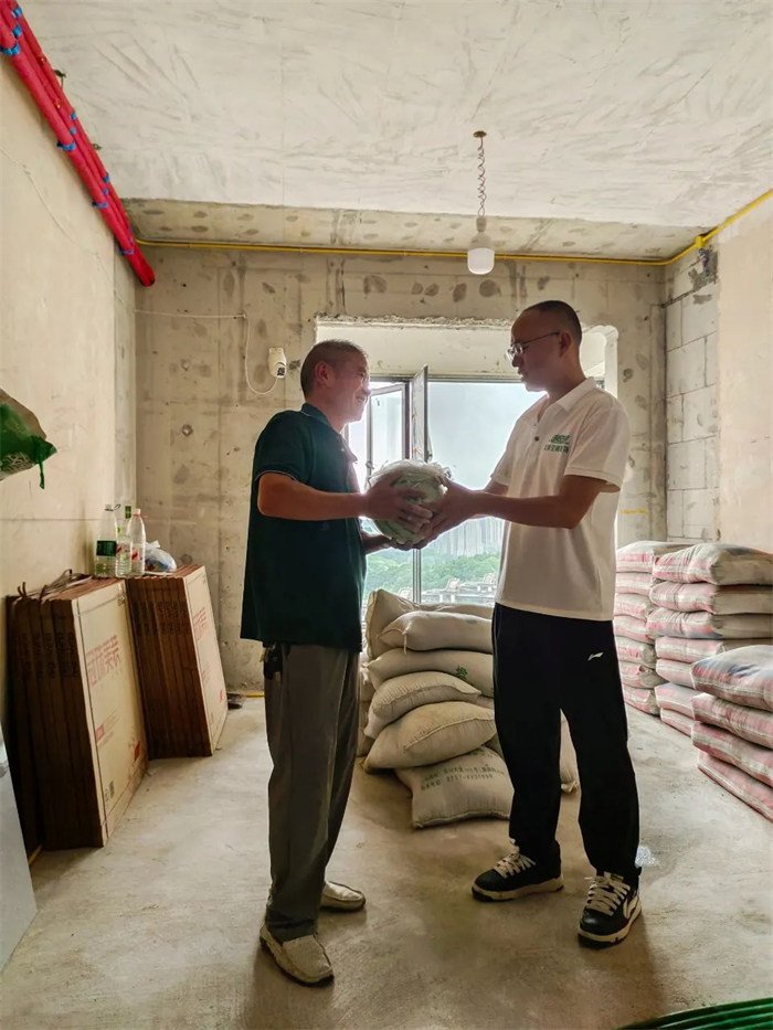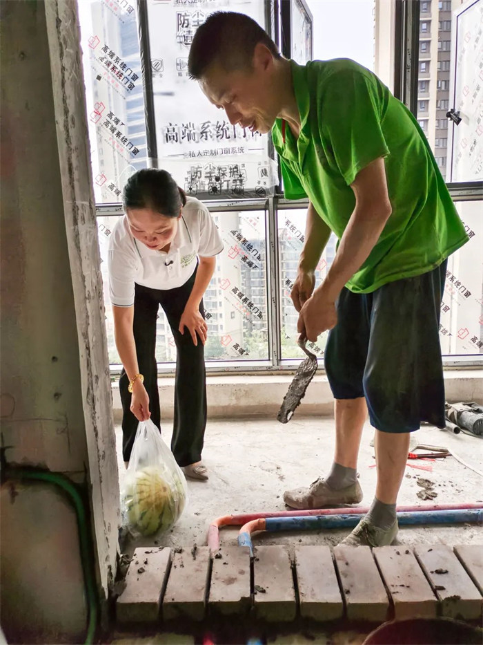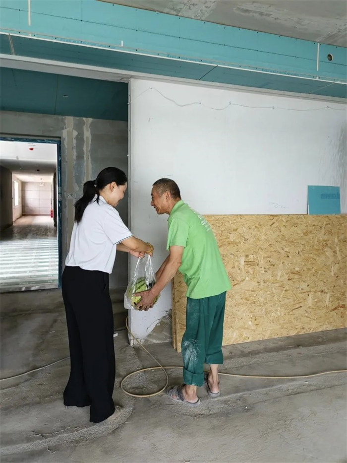 與工程部經(jīng)理一同深入工地現(xiàn)場(chǎng),將滿載心意的清涼飲品與防暑物資送到每一位工人手中。